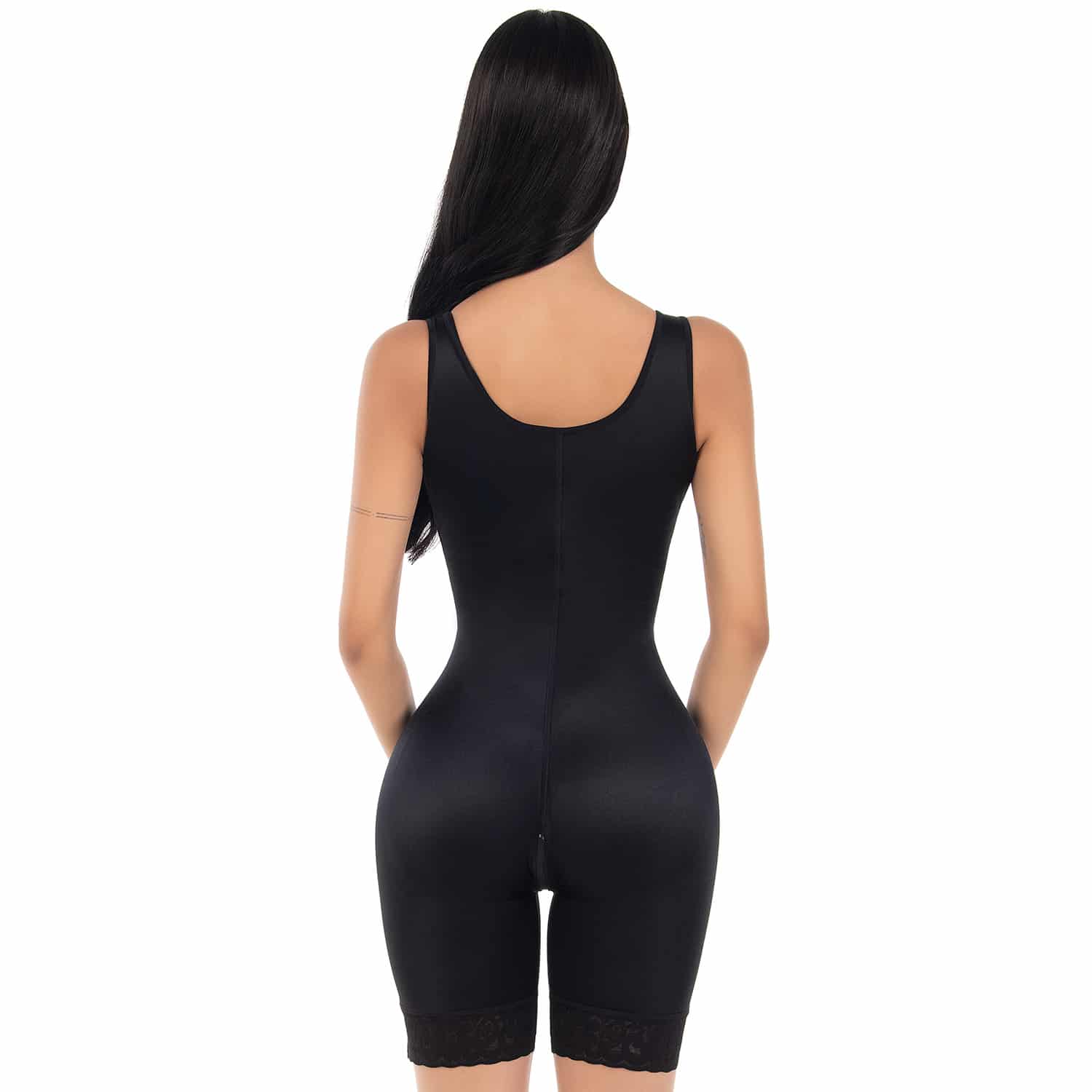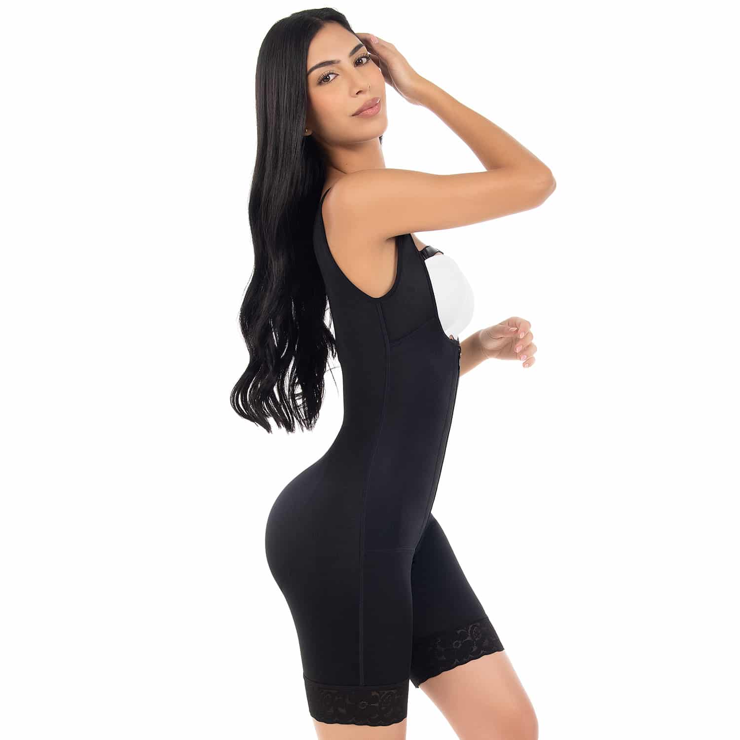 Combinaison très gainante avec remonte fesses léger, dos couvert et bretelles rembourrées.